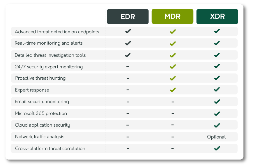 This table provides a side-by-side review of what EDR, MDR, and XDR security levels offer.